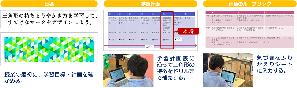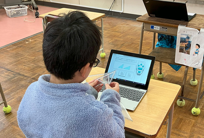算数を学習する児童は、三角形でマークをデザインするために、三角定規の特徴を確かめながらドリルで知識を補完します。大好きなタブレットで学習できることもあり、意欲的に取り組んでいました。