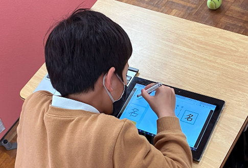 国語を学習する児童は、先生の板書で漢字の書き方を確かめてから、手書きドリルの「eライブラリ手書きex」で漢字練習です。筆順のナビゲーションに沿って練習し、最後に確かめをします。正解すると「すごいでしょう?」と自信に満ち溢れた表情をしています。練習をして、正しく漢字が書けたことで自己効力感につながっているようでした。