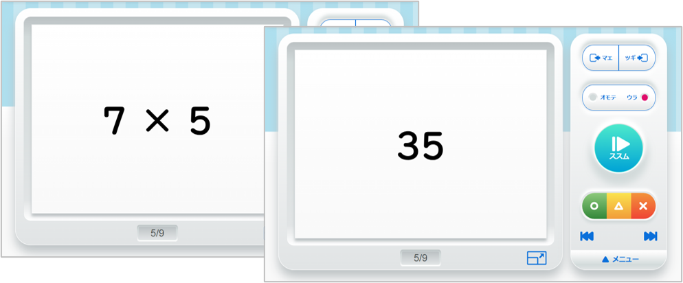 言葉や計算などを繰り返し学習できる、いろいろカード帳を支援に取り入れています。文章を読むことに抵抗のある児童は、長めの文章題が出ると諦めてしまう傾向があります。問題を答えたら、ボタン一つで解答が表示されるいろいろカード帳は、そのような児童に最適です。かけ算九九を学習した児童は、すべての段をマスターできたとのことです。