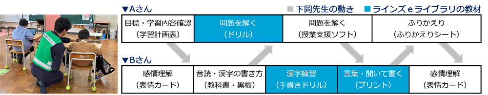 「ラインズeライブラリは、特性の異なる複数名の児童を支援するときにとても重宝しています」と下岡先生。2人の児童を間接指導するときの動き方と教材の使い分け方についてご紹介します。