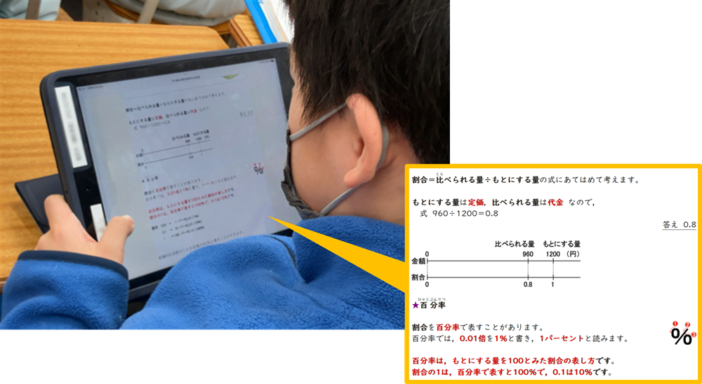 「割合」の単元には、百分率、歩合、わりびき、わりましなど、多くの要素があります。それぞれを「なんとなくわかった」から「できた・わかった」へと、確実な理解に前進させたいと考え、担任の髙田先生はこの日、復習の時間を取りました。