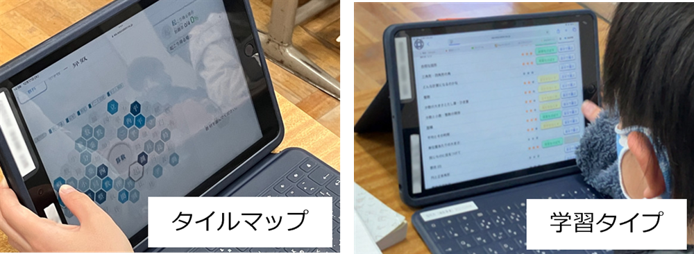 ▲タイルマップや、単元学習の「学習タイプ」では、児童が自分の学習状況を俯瞰(ふかん)できます。授業中にも「どれくらい進んだか」「どこが苦手か」を、児童はしっかり見ていました。