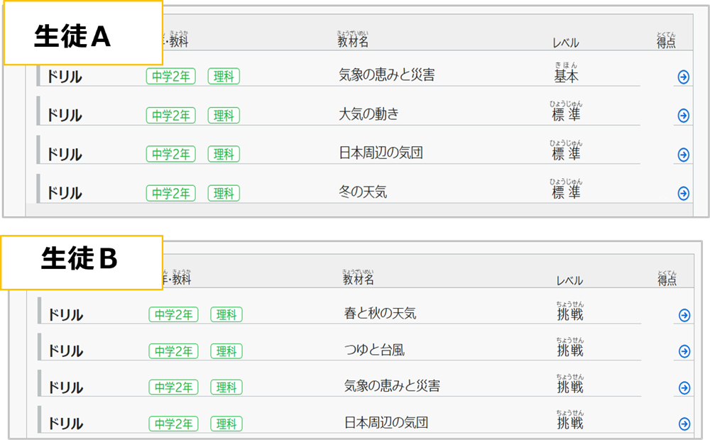 齊藤先生から「最後は一人一人に合った課題に挑戦しよう」と声を掛け、「⾃動個別課題」を出題しました。一人一人に出題される教材数や内容が異なっているため「全部挑戦レベルだ!嬉しい」「圧力の計算、苦手なんだよな。だから基本レベルか」など、友達同士、課題を見比べながら自分の理解状況を把握し取り組んでいました。「全部100点になるまで頑張ろう」と、何度も自動個別課題の教材にリトライする姿が見られました。