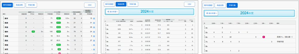 ▲成績管理へ>個人ビュー>【教科別履歴】【取組姿勢】【学習行動】から、一人一人の取り組みを確認