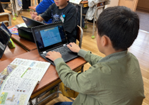 最初に、課題設定のためのヒントが先生から提示されます。子どもたちは、グループワークか個人ワークか、レポートは紙かスライドかなど、自分で課題の進め方やツールを決めて取り組み始めました。