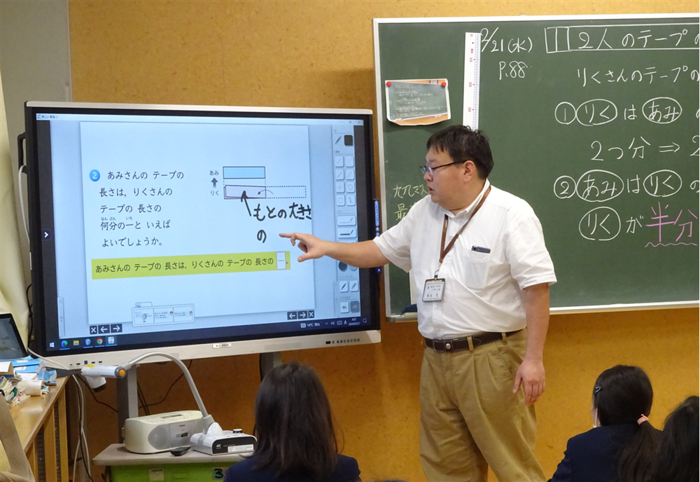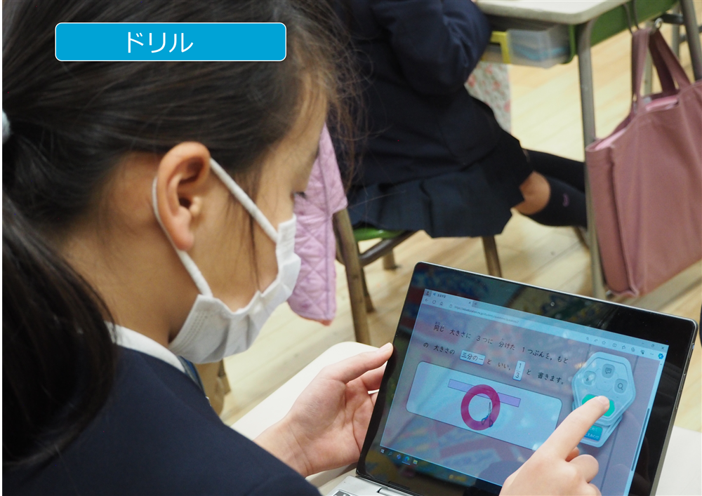 この日の授業では「倍と分数」について教科書の問題を全体で確認した後、先生からの「もっと問題を解きましょう」という声掛けのもと、ラインズeライブラリのドリルに挑戦しました。児童は自分で基本問題から標準問題、そして挑戦問題と順に取り組みます。教科書の問題だけでは演習量が足りないときに、ラインズeライブラリの問題を使って演習を重ね、経験を増やしているそうです。