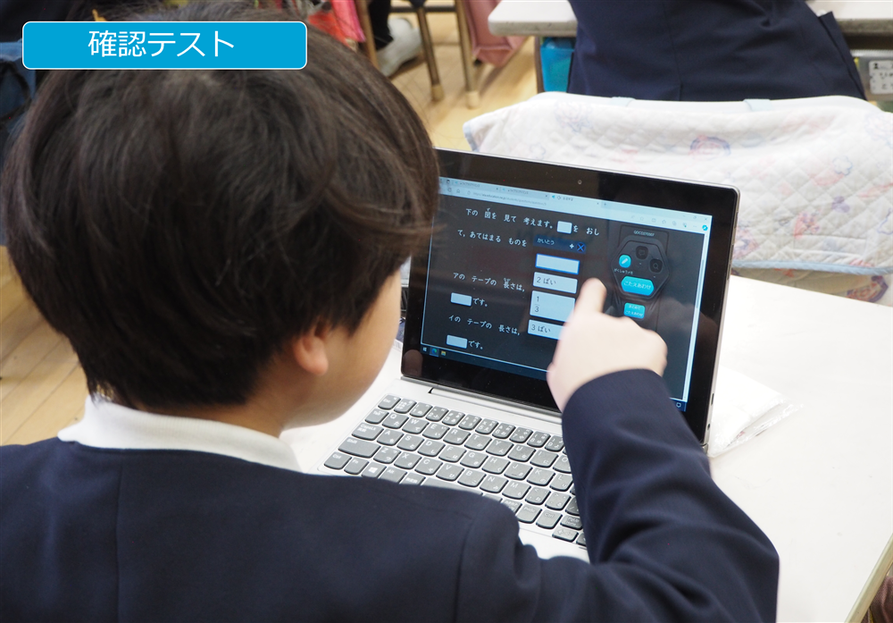 ドリルを自分のペースで解いた後は、翌日のテストに備えて、一斉学習で確認テストを行いました。繰り返しドリルを解かせた後に児童の習熟度を測る目的で、授業時間に合わせてテストを予約配信していました。「分数のような学年を越えた系統的なものを、その学年に合わせた内容で数多く反復学習できるのは非常に効果があります」と根本先生。理論的な説明だけでなく、さまざまなパターンの問題を繰り返し解くことで、必然的に分数の概念を習得することができます。