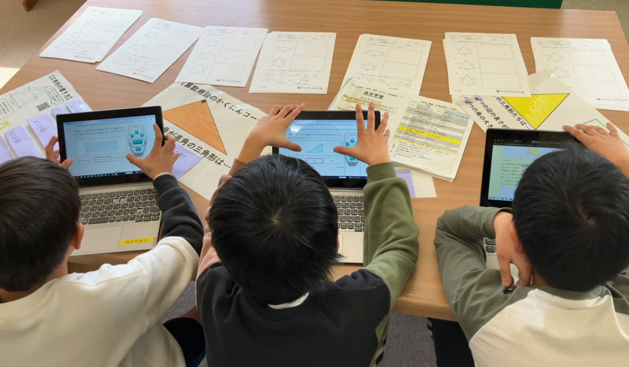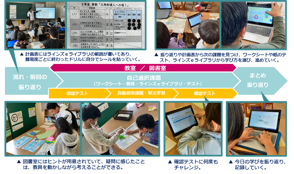 ラインズeライブラリは、自動採点や確認テスト後のガイドなど、児童に委ねることを意識した作りになっていて、このような授業形態に、とても合っています。