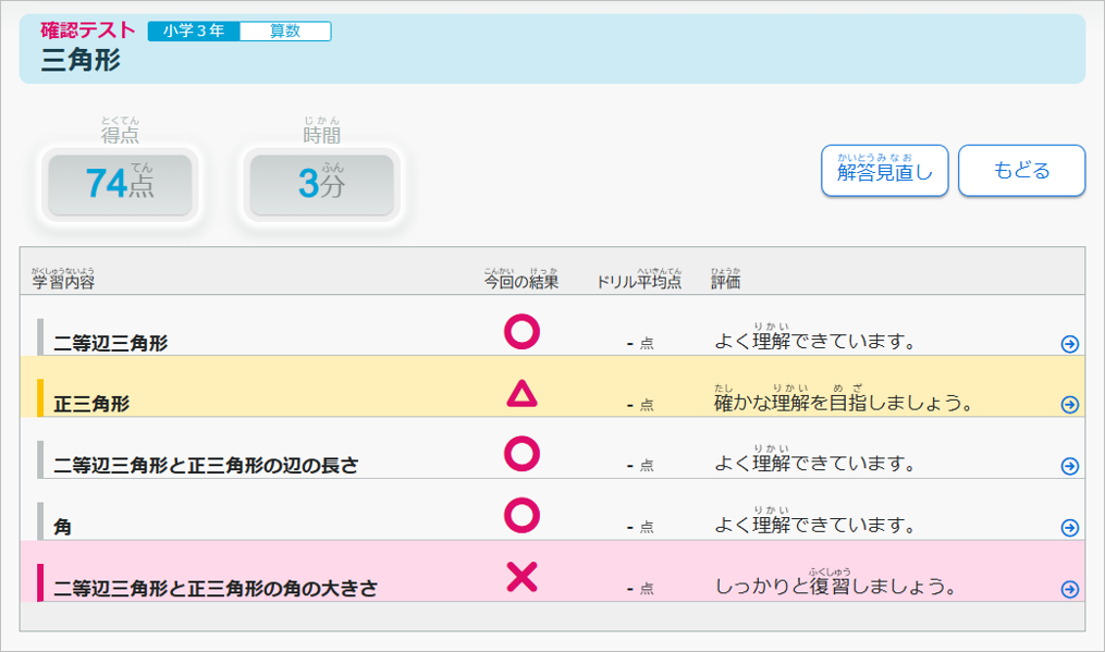 - 確認テストの結果が「○△✕」で表示され、児童が自分の課題を見つけやすい。