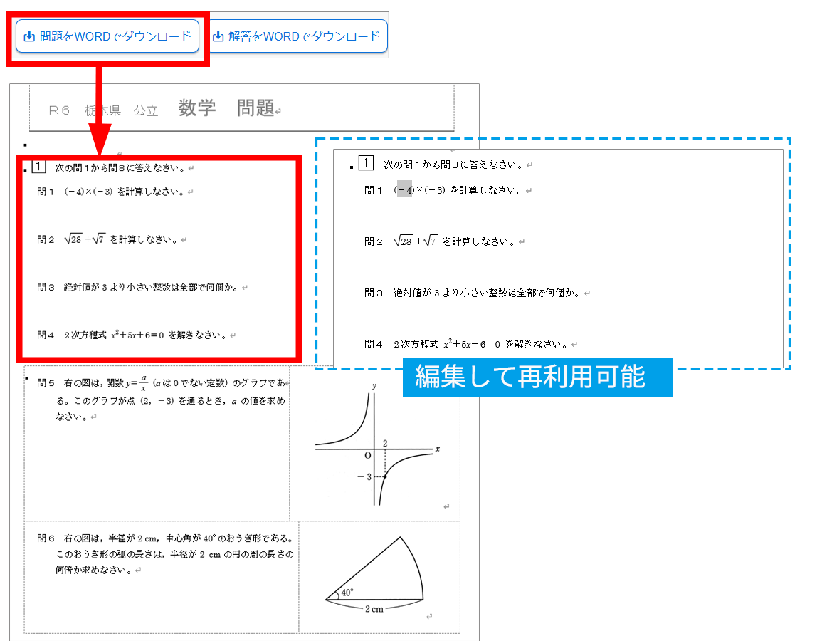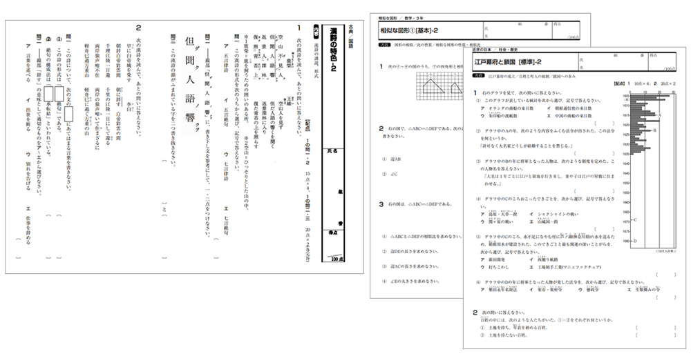 過去3年分4教科(数・理・社・英)の全国公立高校入試過去問題を収録しています。挑戦したい教科や都道府県を選ぶと、問題と回答用紙がすぐに出力できます。また、先生メニューからはWordで編集できるので、高校入試問題を使ったオリジナルプリントの作成もできます。