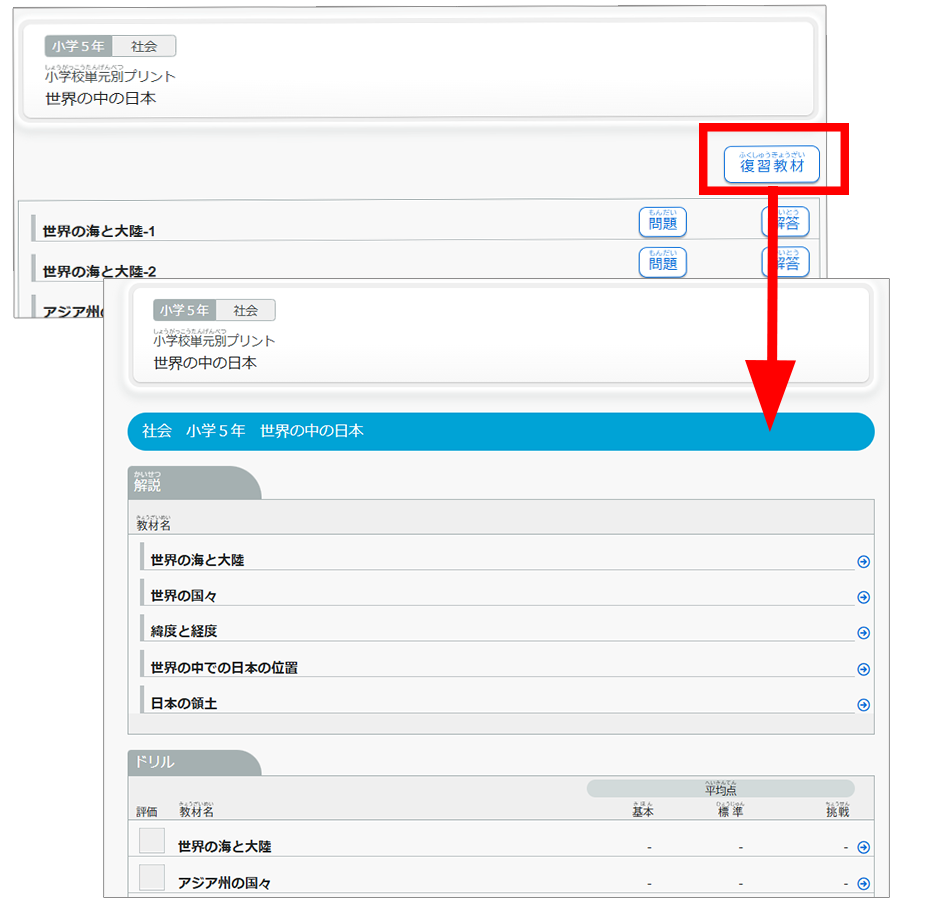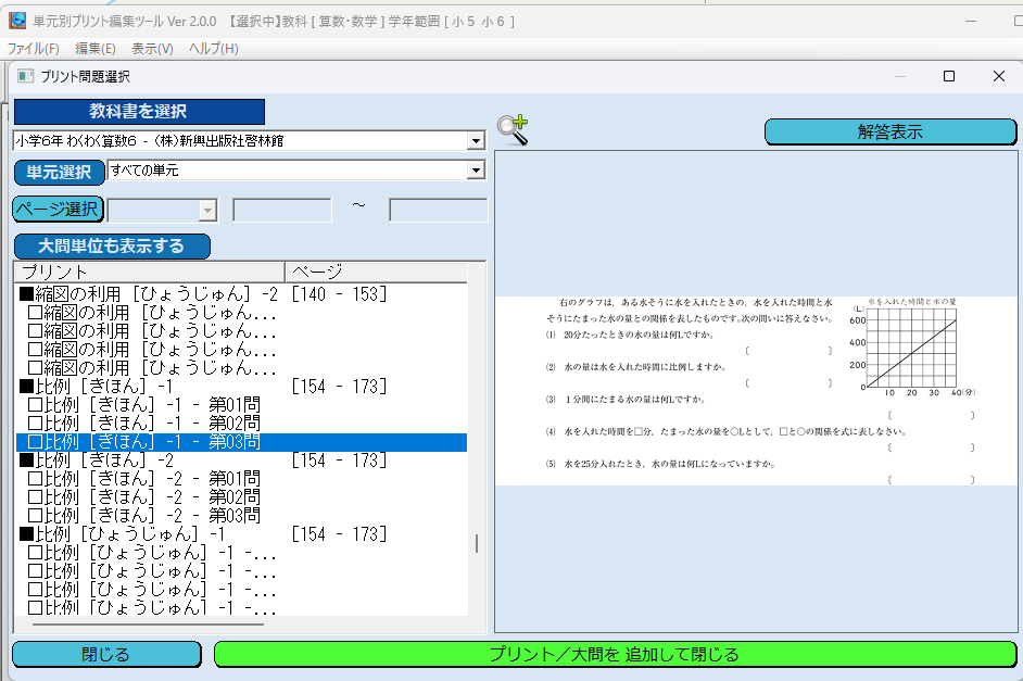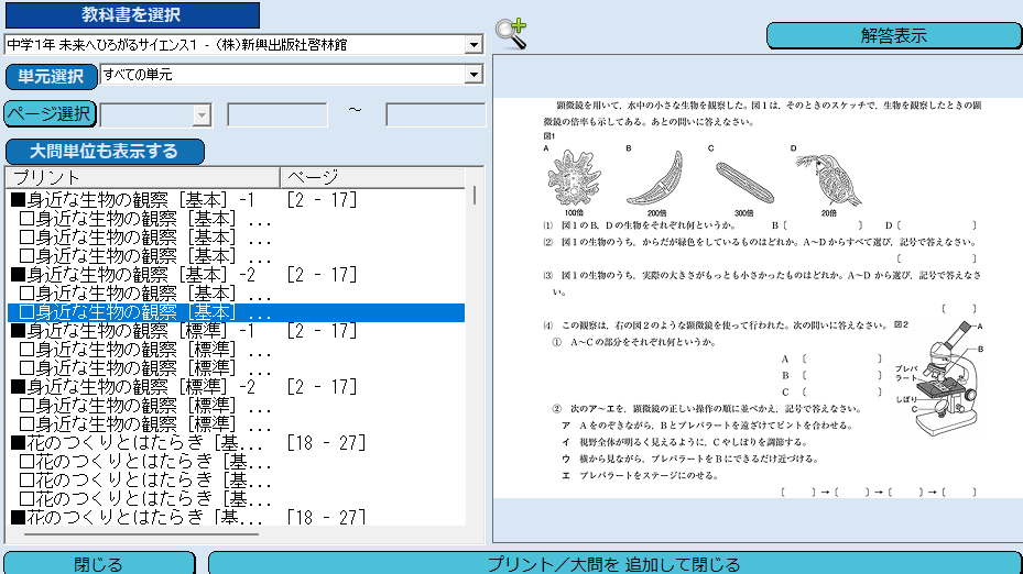 単元別プリント編集ツールを使うと、単元別プリントに収録されている問題を大問単位で選んで組み合わせ、先生のオリジナルプリントを作成できます。(※先生メニューのみ)