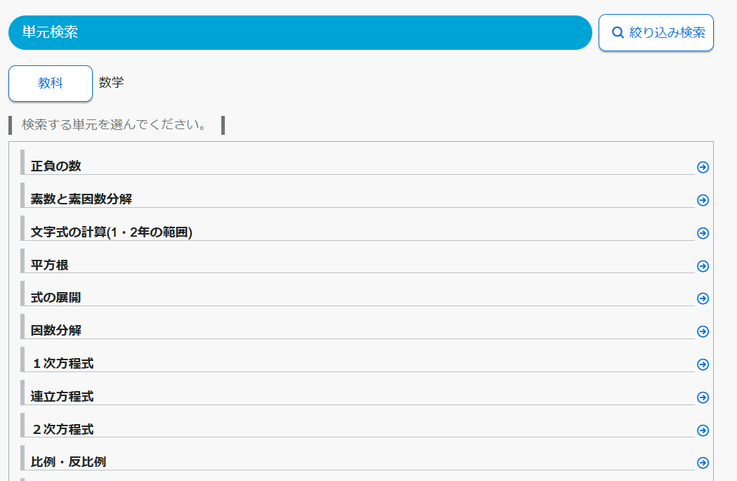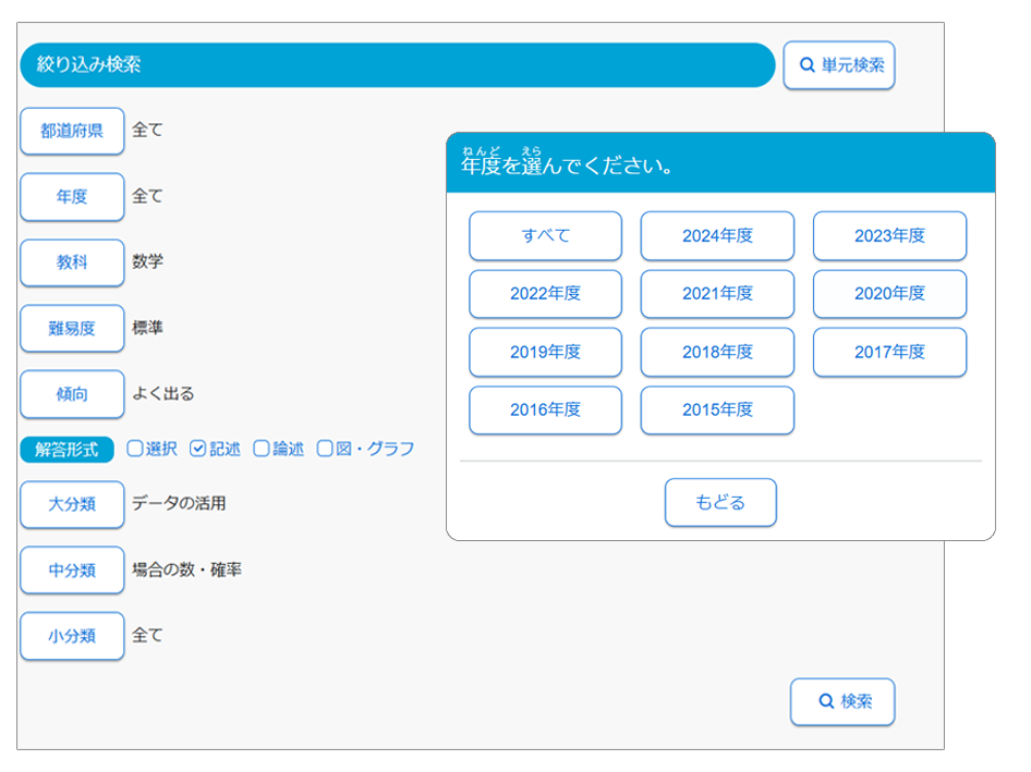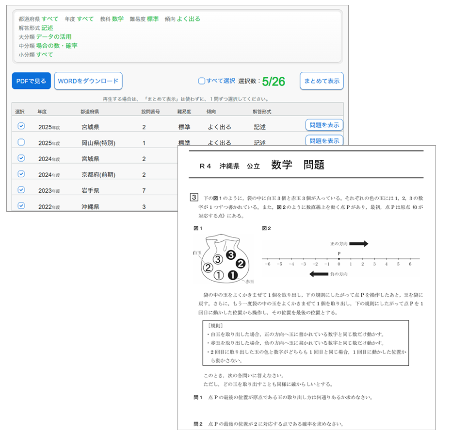 高校入試過去問データベースでは、全国10年間分5教科(国・数・理・社・英)の過去問題を難易度や出題傾向、単元から検索して出力できます。