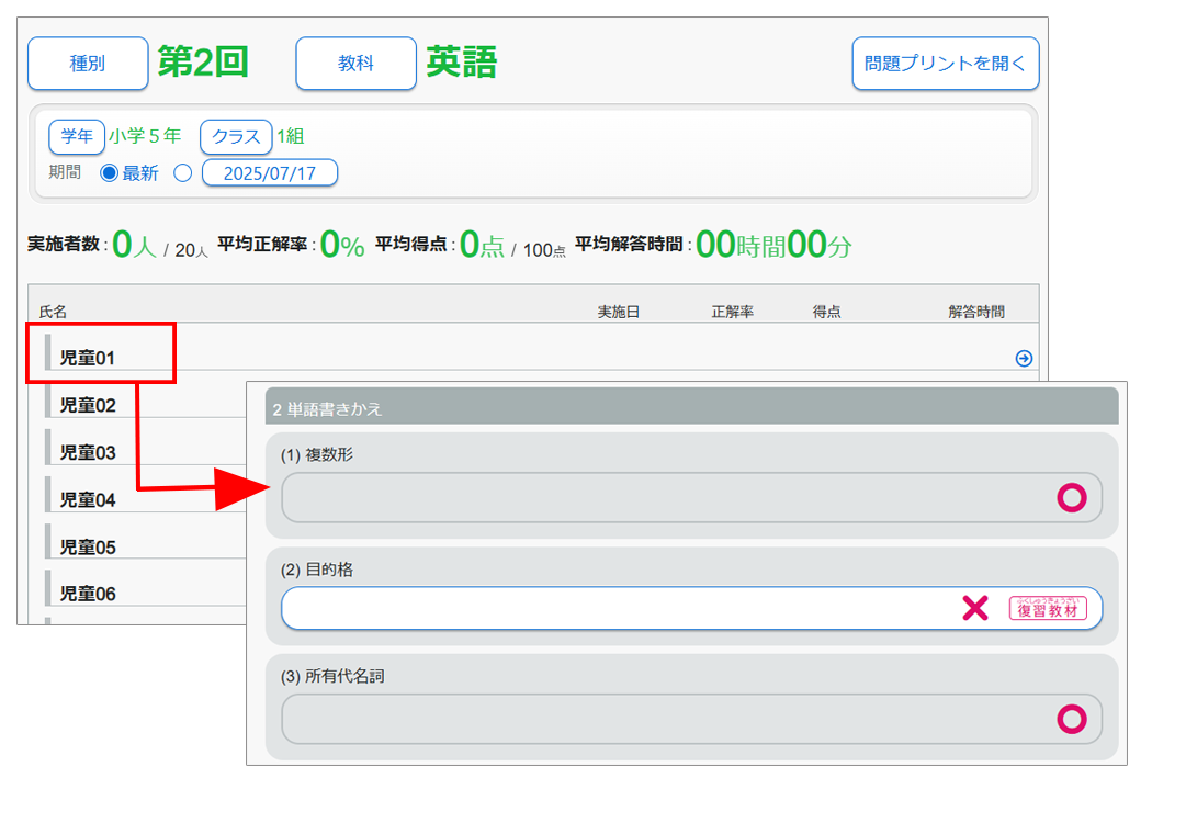 実施後は結果を入力して、クラスの平均点などから理解度を分析できます。入試前の対策として挑戦できます。