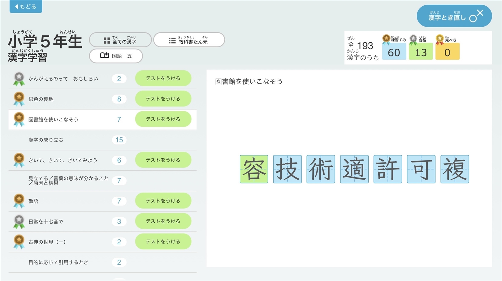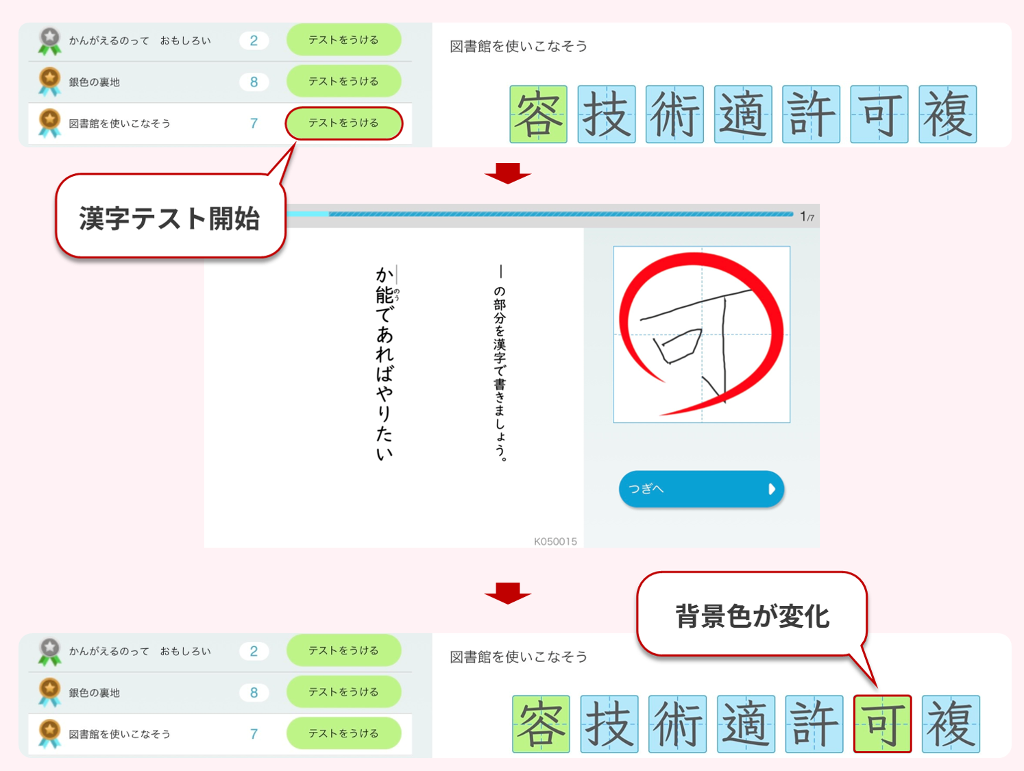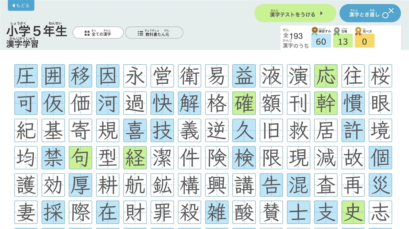 一度練習した漢字は、教科書ページなどのまとまりでテストを受けることができます。正解すると漢字の背景色が変わるため、自分がどれくらいできているかを一目で把握でき、学習状況を俯瞰して捉える意識の育成につながります。