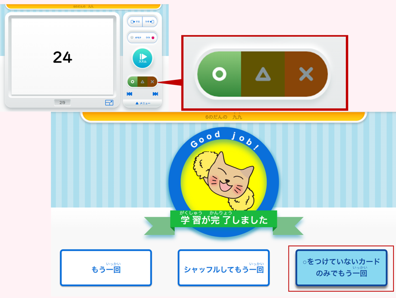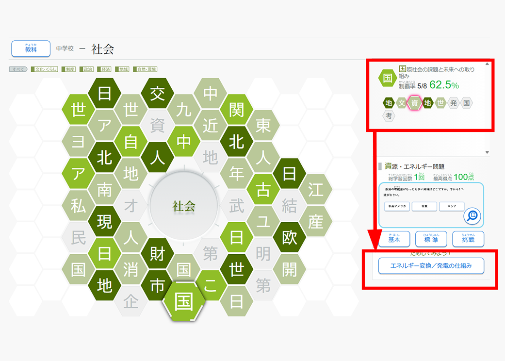 点数や理解度に応じて、基本に戻ったり挑戦問題に進んだりできます。