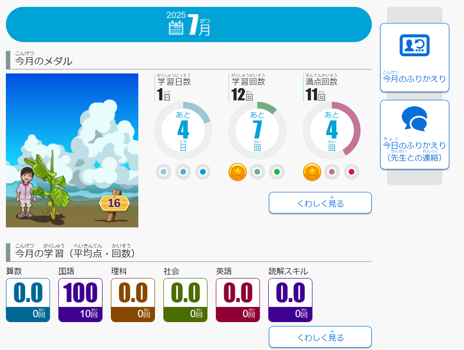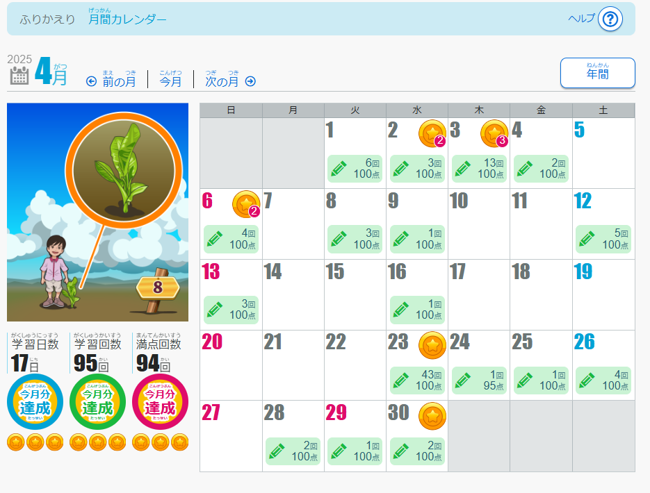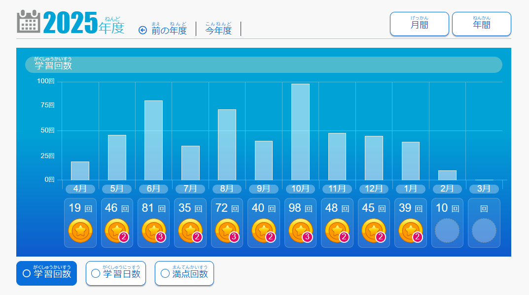 日ごとの学習回数やメダルの獲得回数だけでなく、その月のメダル獲得状況もわかるため、日ごとや月ごとで自分の頑張りを俯瞰してみることができます。