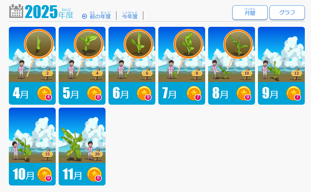 月ごとの一覧で確認できるので「前の月よりがんばろう」「今月はメダルを全部もらえるようにがんばろう!」など、子ども自身で目標を立てて取り組むことができます。