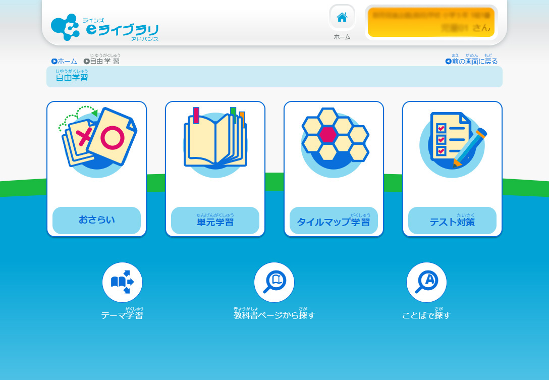 子どもがラインズeライブラリの中の教材を、教科書ページを入力したり、任意の言葉を入力したりすることによって効率的に見つけ、学習できます。