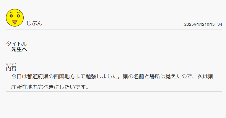 学習のふりかえりだけでなく、がんばったことや先生に伝えたいこともイラストとメッセージで送ることができます。