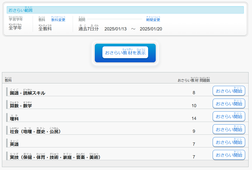 期間は変更可能なので、決まったタイミング以外にも、おさらいの教材数が多くなってしまったり、子ども自身で気になったタイミングで挑戦できます。
