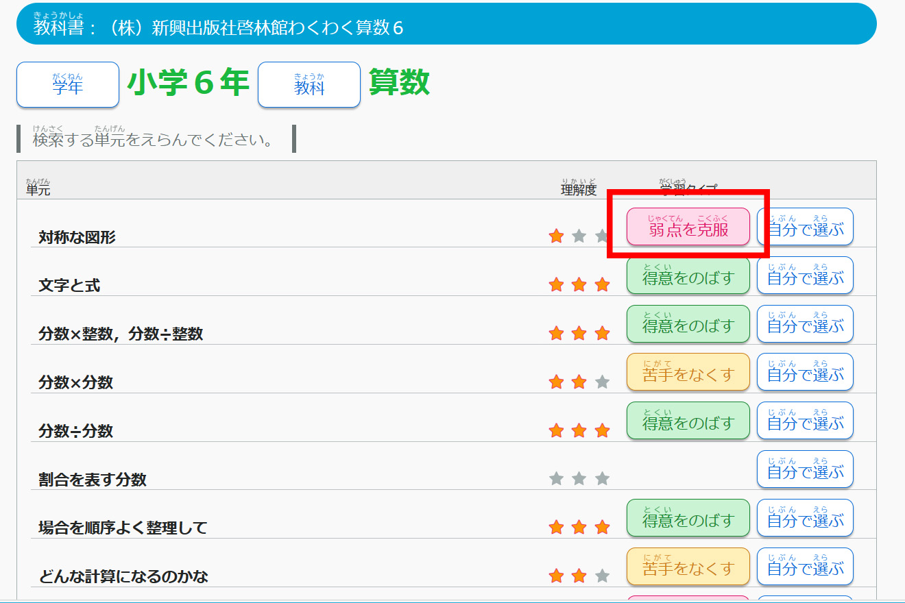 授業の単元に沿って、教材や難易度別を選んで学習できます。教科書対応しているため、学校で使用している教科書と同じ単元名と順番になっており、教材を探しやすくなっています。