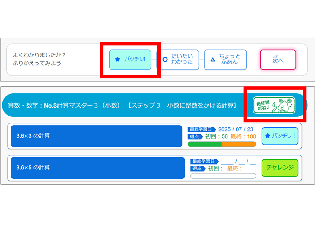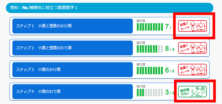 スタンプは平均点や進み具合など、状況に応じてメッセージが変わり、1つずつステップアップしていくので、子どもが喜びや達成感を味わうことができます。