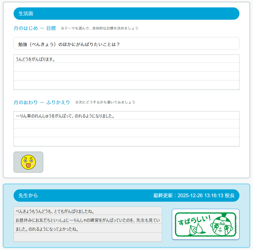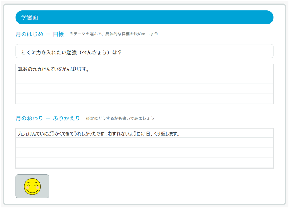 「学習面」と「生活面」で月の初めに目標を決め、月の最後に子ども自身でふりかえりを行った内容を確認します。子どもの自己調整学習をサポートします。