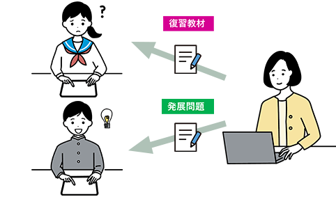 判別された課題タイプに応じて、学年や単元を越えた復習教材や解説教材が出題されるため、それぞれの子どもに必要な知識を効率的に身につけることができます