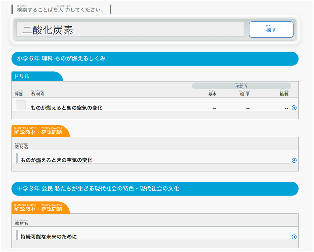 入力したキーワードを含む教材を、学年や教科を越えてすぐに見つけることができます。