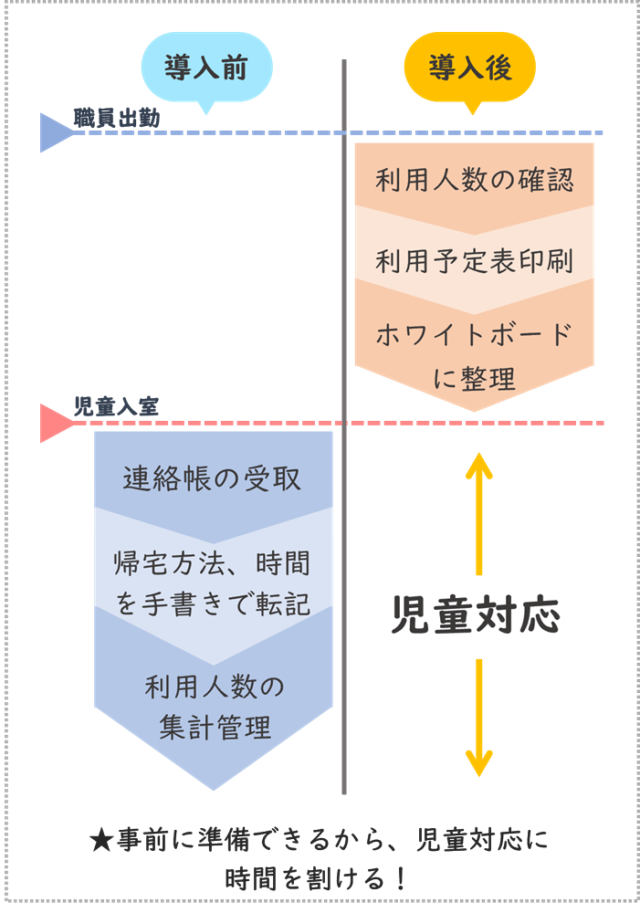 以前は連絡帳を使って、子ども一人一人の帰宅時間を当日確認していました。実際に連絡帳を受け取るまで利用時間が分からないので、事前に準備をすることが難しい状況でした。現在は、保護者が事前に利用予定を登録するため「今日は何人来るのか」「何時まで利用するのか」をあらかじめ把握でき余裕をもって受け入れ準備ができるようになりました。