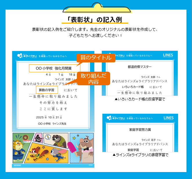 先生方が、ラインズeライブラリアドバンスでの学習の頑張りを、表彰状を使って認めることで、子どもたちの学習意欲がより高まることを期待しています。
